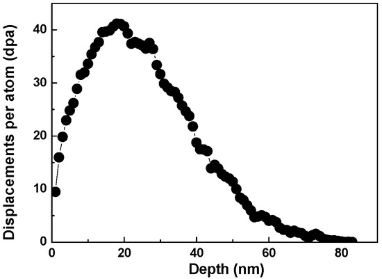 The irradiation experiments were carried out in the Accelerator Laboratory of Wuhan University and the samples were irradiated to a peak dose of 40 dpa with 100-keV Fe ion at 300 °C. The damage profile calculated by the Stopping and Range of Ions in Materials (SRIM) code simulation is shown in Figure 1, where the displacement energy was Ed = 40 eV. A uniform ion beam current (~1 μA) was created for holding by scanning in both the horizontal and vertical directions. The sample temperature was monitored with a thermocouple throughout the irradiation process, which touched the implantation surface of the sample. The microstructure analysis and composition measurements were conducted with a field-emission-gun analytical Tecnai G2 F30 microscope (Beijing, China), which had a nominal spot size of 0.5 nm, equipped with an energy dispersive X-ray spectroscopy (EDX) system.