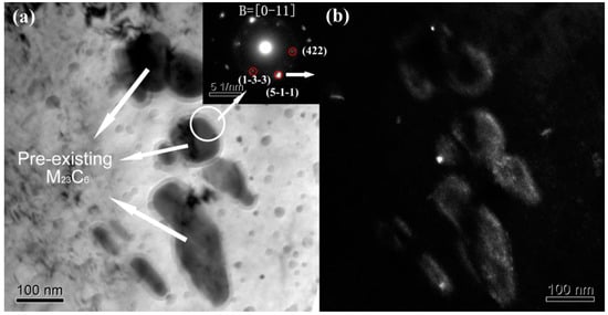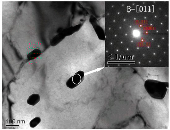 Figure 2 shows the unirradiated microstructure of a RAFM steel sample containing many pre-existing carbides with sizes of approximately 100–300 nm along the long axis in the matrix. A bright-field micrograph after 40 dpa of Fe ion irradiation at 300 °C is shown in Figure 3. A systematic selected-area electron diffraction (SAED) pattern of the pre-existing precipitates obtained from the unirradiated and irradiated specimens are shown in the upper right of the panels in Figure 2 and Figure 3a, respectively. The calculated d-spacing of the (111), (200), (331), (422) and (511) spots were 0.6145 nm, 0.532 nm, 0.244 nm, 0.217 nm and 0.205 nm, respectively, which is parallel with the Pcpdfwin file (No. 781500) that originated from the M23C6 consisting mainly of Cr and Fe. It should be noted that the and (200) reflections make a [011] zone axis (Figure 2), which paralleled the zone axis by (422), and reflections in Figure 3a.