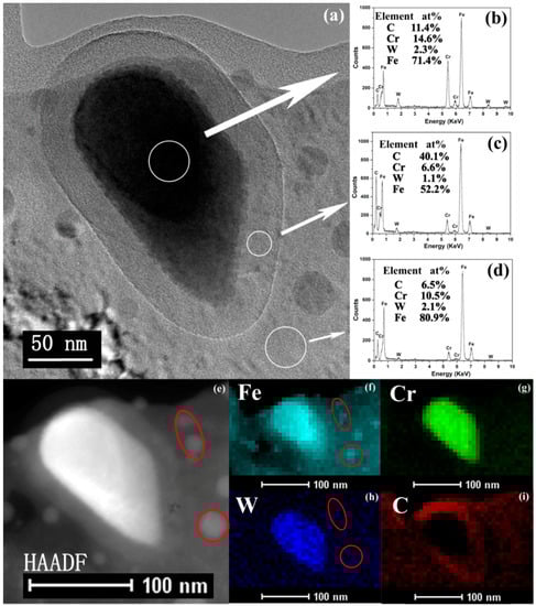 (a) Micrograph of the M23C6 precipitates after Fe ion irradiation; (b–d) Chemical compositions in the different regions marked by the white arrows are analyzed by EDX; (b) EDX energy spectrum of the precipitate region; (c) EDX results at the matrix/carbide interface (amorphous region); (d) EDX spectrum of the matrix; (e) HAADF–STEM image and (f–i) corresponding EDX elemental mappings of Fe, Cr, W and C elements for the pre-existing M23C6 precipitate and the new phase, respectively.