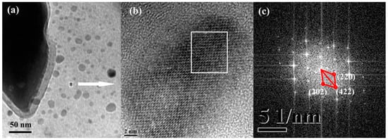 (a) TEM micrograph of the small precipitates in the matrix of RAFM steel irradiated with 40 dpa Fe ion at 300 °C; (b) Corresponding HRTEM image of the small precipitate; and (c) Fast Fourier transformation (FFT) pattern of the white square region in (b).