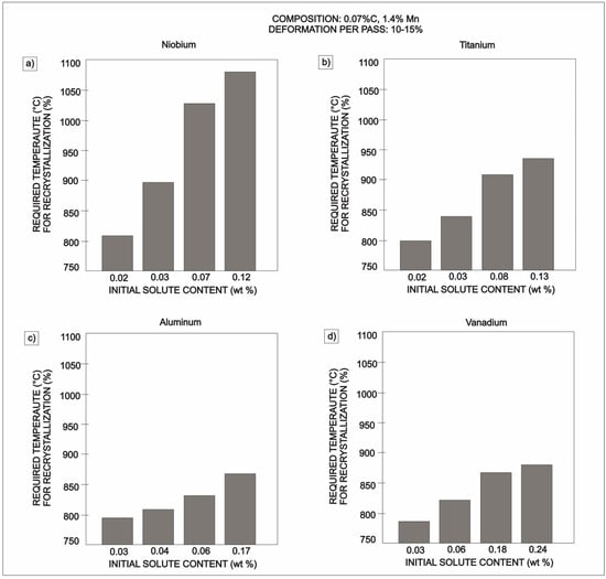 Austenite recrystallization as a function of microalloying content, (a) niobium, (b) titanium, (c) aluminum and (d) vanadium, content [12].