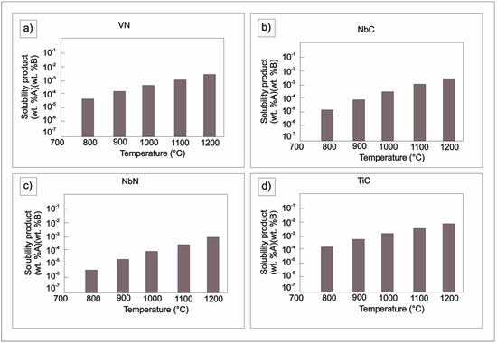 Carbonitrides solubility as a function of temperature, (a) vanadium nitride, (b) niobium carbide, (c) niobium nitride and (d) titanium carbide [27,28].
