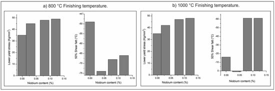 Research by Kozasu et al. [43] showed that equivalent low temperature fracture toughness can be achieved at 1000 °C finishing temperature when 0.10 percent niobium is used compared with 800 °C finish rolling temperature (Figure 6).