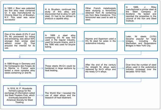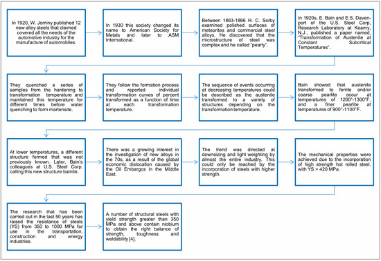 Through history, great developments have been made concerning the manufacture processes of microalloyed steels, which have brought great benefits to the development of society, owing to their high strength provided by the alloying elements in their composition. Figure 9 and Figure 10 show a brief summary of the most relevant events spanning from the year 1865, with the first patent of a steel alloy with Chromium (Cr), through the formation of the group for the exchange of information called steel treaters club, which later became the American Society for Metals (ASM), until the decade of the 1970s.