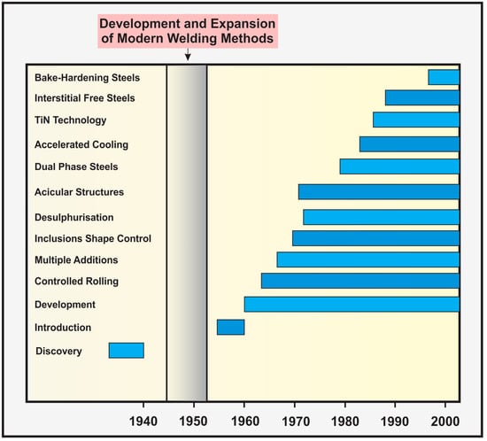 Figure 11 shows the development of HSLA steels from 1940 to 2000, the data of which were published and included in the proceedings of international conferences [67,68,69,70,71].