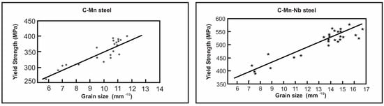 where σ0 and ky are experimental constants. An example of the grain size effect on the strength of a plain carbon steel and C-Mn-Nb steel is shown in Figure 13.