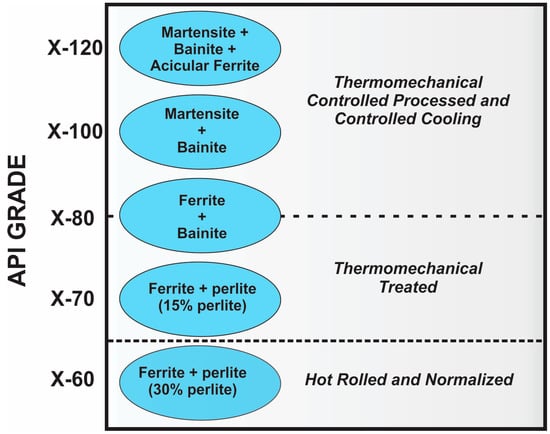 In the last 50 years, the strength of steels has increased progressively thanks to advances in metallurgy and manufacturing techniques in response to the market demand for lighter and stronger steels. The need to achieve these characteristics of higher strength and weldability with sufficient toughness and ductility has led to the development of high strength low alloy (HSLA) steels. HSLA steels typically contain very low carbon content and small amounts of alloying elements [1], and these are classified by the American Petroleum Institute (API) in order of its strength (X-42, X-46, X-52, X-56, X-60, X-65, X-70, X-80, X-100 and X-120). These properties are achieved by a careful selection of microalloy composition and optimization of thermomechanical processing (TMP) and accelerated cooling conditions subsequent to the TMP.