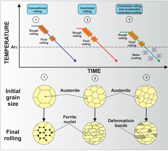 Grain size refinement in steels (Figure 7) holds a great deal of promise since it provides improved strength as well as toughness. Currently, ferrite grain refinement is achieved by a combination of controlled rolling and accelerated cooling. It has been found that this process can achieve a refinement of about 50% in steel plates of simple compositions. In the plate rolling process of a plain carbon-manganese (C-Mn) steel, grain size can be refined from 10 µm up to 5 µm when the plate is controlled rolled and accelerated cooled. This refinement in grain size increases the yield strength of the steel by about 80 MPa according to the well-known Hall–Petch relationship [60,61].