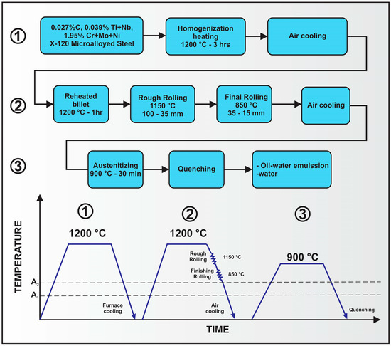 One of the most efficient and commonly employed methods to improve and control the mechanical properties of steels is the TMCP. This technology has been developed and applied to the industry in a fast manner. A high production volume of steels has been manufactured through this process due to its excellent results. The main principles behind this process are the ability to refine the austenite grain size, increase the defect density, accelerate the precipitation of micro-alloying elements, and control the type of obtained phases [37]. This process has been used more and more, replacing the heat treatment techniques of normalizing, quenching and tempering the heat process. The TMCP helps to make cheaper and simpler the production process of low-carbon bainitic steels, in addition to providing high strength, high tenacity, and good weldability. One of the options to achieve these properties is to increase the microalloying contents, such as Nb, Ti or V; besides affecting austenite microstructural evolution, it contributes greatly to increasing precipitation hardening and dislocation density. One of the problems with high strength low alloy (HSLA) steels is the complex interaction between their hardening mechanisms, making it difficult to optimize parameters for their manufacture.