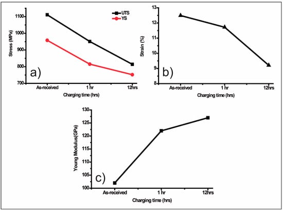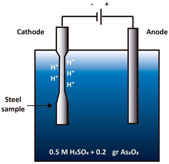 - Depover, T.; Escobar, D.P.; Wallaert, E.; Zermout, Z.; Verbeken, K. Effect of hydrogen charging on the mechanical properties of advanced high strength steels. Int. J. Hydrog Energy 2014, 39, 4647–4656. [Google Scholar] [CrossRef]
