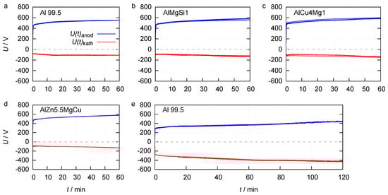 Figure 2. Anodic and cathodic process voltage envelopes for 1 h of PEO on Al 99.5, AlMgSi1, AlCu4Mg1 and AlZn5.5MgCu in electrolyte 1 (ad) and 2 h of PEO on Al 99.5 in electrolyte 2 (e).