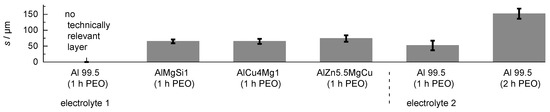 Figure 3. Layer thickness produced by PEO (symmetric bipolor rectangular current pattern of 30 A/dm 2 ) in dependence of the substrate material and adjusted process parameters.