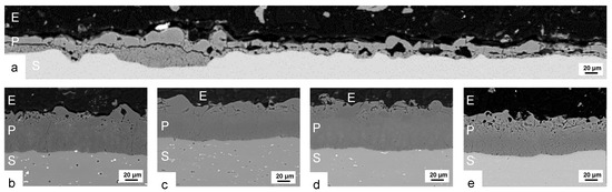Figure 4. Representative cross sections of coatings produced by PEO (symmetric bipolor rectangular current pattern of 30 A/dm 2 , 1 h) on Al 99.5 (a) and the three alloys AlCu4Mg1, AlMgSi1, AlZn5.5MgCu (bd) in electrolyte 1 and on Al 99.5 in electrolyte 2 (e). E—embedding resin, P—PEO coating, S—substrate.