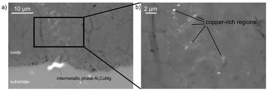 At the substrate/oxide interface, a Al 3 (SiFeMn) phase is found to be oxidized in steps. The EDX analysis of the intermetallic phase shown in Figure 6 in comparison to similar intermetallic phases in the unaffected substrate reveals a depletion of iron and manganese with a concurrent slight enrichment of magnesium and a significant increase in oxygen content. No iron or manganese is detected in the PEO coatings, which indicates that these elements are eventually dissolved into the electrolyte. In any case, not even one of the observed intermetallic phases with such a conspicuous element content variation is detected in the whole unaffected substrate in the considered cross-section. Since this phenomenon appears at the oxide/substrate interface and a significant amount of oxygen is detected by EDX only in this phase, which appears darker in Figure 6, it is ascribed to the oxidation of the substrate during the PEO process. For the AlCu4Mg1 substrate, a low amount of copper is detected in the inner, compact part of the coating. In the outer, more porous part of the coating, a low, yet substantial amount of silicon (approx. 2 wt. %) is detected, which originates from the silicate electrolyte. Figure 7 shows a detail of a PEO coating on the AlCu4Mg1 alloy using backscattered electrons (material contrast). The regions with a high brightness correspond with the occurrence of copper, which was identified by EDX analysis (not shown here). Copper is incorporated into the coating presumably as copper oxide. However, the occurrence of the copper-rich regions obviously does not cause exorbitant flaw formation in the coating, e.g., because of excessive oxygen evolution at copper-containing intermetallic phases.