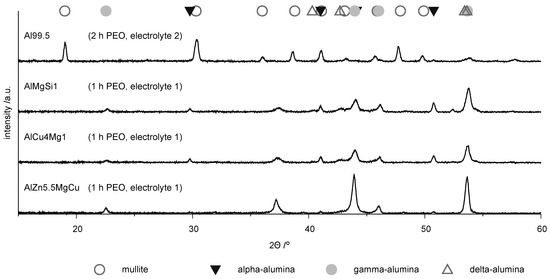 Information on the phase composition of the coatings is derived from XRD. The phase composition of the coatings depends on the substrate. Figure 8 shows the X-ray diffraction diagram for the PEO coatings on the four investigated materials. The highest characteristic intensities of the phases are denoted with symbols above the diffraction diagrams.