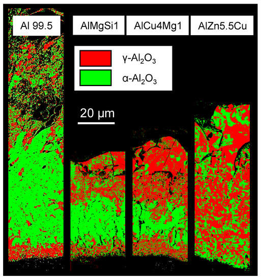 The diffractogram of the PEO layer on technically pure aluminum differs from the other patterns by significant peaks of the aluminum silicon mixed oxide mullite. The appearance of this phase can be explained by the incorporation of constituents of electrolyte 2, in which the silicate content was higher. The diffraction pattern of the coatings on the high strength alloys are similar and show characteristic peaks for the α -, γ - and δ -phases. However, it is noticeable that on the AlZn5.5MgCu alloy the peaks for the α -phase are distinctly less pronounced. It can thus be stated that the existence of zinc in the alloy obviously impedes the formation of the α -alumina phase, which is supported by the results of other researchers [10,11]. The results of the EBSD measurement show the distribution of the single phases within the layers and are depicted in Figure 9.
