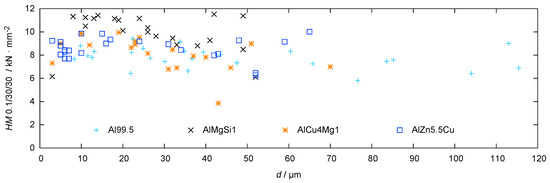 The high test load of 100 mN allows for an integral assessment of the coating hardness. In other words, the size of the hardness indents are at least in the same order of magnitude as the typical flaws in the coating. Thus, the measured values are expected to reflect both the phase composition and the coating morphology. All investigated coatings show a graded hardness profile which is in good correlation with the findings regarding layer morphology and phase composition. In general, the inner zone shows a higher hardness than the outer one, which can be explained by the denser structure of the working layer in comparison to the technological layer (see Figure 4). In addition, in case of Al 99.5, AlMgSi1 and AlCu4Mg, the increased hardness in the inner layers can be explained by the enrichment of corundum in these regions (see Figure 9). However, the coatings which were obtained on technically pure aluminum show the lowest hardness values despite their high amount of this phase. This can be attributed to the numerous defects within these layers (see Figure 5). The coatings which were generated on AlZn5.5MgCu show elevated hardness values close to the substrate and a hardness profile with a small fluctuation range at the outer zones. This can be attributed to the enriched corundum content at the substrate/layer-interface and the uniform distribution of corundum and the γ -phase within the rest of the layer (see Figure 9). Nevertheless, compared to the bare aluminium substrate, which has a hardness of approx. 1900 N/mm 2 (measurement of the AlZn5.5MgCu alloy), the hardness is in any case significantly increased by the PEO coating.