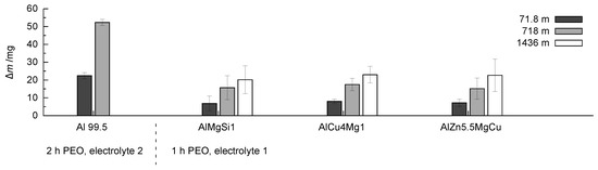 Figure 12. Comparison of the mass loss Δ m in dependence of the wear distance in the rubber-wheel test for coatings produced by PEO (symmetric bipolor rectangular current pattern of 30 A/dm 2 ) for the investigated coatings.