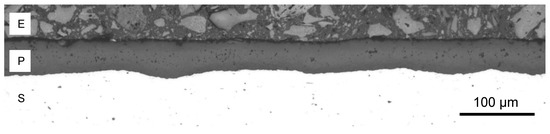 Figure 13. Representative cross section of the wear trace of a PEO coating on the AlMgSi1 alloy after a sliding distance of 1436 m (rubber-wheel test ASTM G65 B). In comparison to Figure 4, it is evident that only the outer, rather porous part of the oxide coating was removed. E—embedding resin, P—PEO coating, S—substrate; contrast of embedding resin against coating has been increased by image manipulation.