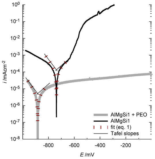 Figure 14. Representative current density-potential curves for the bare and the PEO-coated AlMgSi1 substrate in 0.1 mol/L NaCl solution: The PEO coating reduces the current flow (indicating the corrosion activity) significantly, especially for high anodic potentials. The fitted curves, according to Equation (1), for the determination of the corrosion current density are given for comprehensibility.