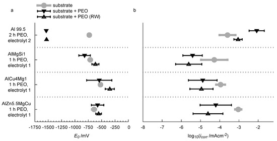 It is obvious that the oxide coating significantly decreases the current density over the whole potential range. For reasons of comprehensibility, the obtained fits of the Butler-Volmer equation (Equation (1)) are also included in the diagram. The Butler-Volmer equation is only valid for small overpotentials. For the shown curves, it is in good congruence with the measured values for a potential range of approx. ±40 mV around the free corrosion potential. The corrosion current densities and free corrosion potentials obtained by this method are considered as an appropriate parameter for describing the corrosion tendency of the samples. The results of the current density-potential curves for the bare alloys and the PEO-coated alloys are shown in Figure 15a (free corrosion potential) and b (corrosion current density).