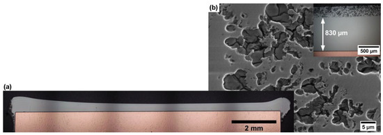 A cross-section of a typical deposit from this study is shown in Figure 1a. A homogeneous layer with smooth surface is obtained in the center of the substrate. Near the edge of the substrate, the layer thickness increases due to the edge effect, which also results in the growth of dendritic-like features directly at the edge of the samples. This structure can be maintained up to a thickness of more than 800 μm. However, if the deposition process is continued even longer, ceramic particles are included into the deposit resulting in a metallic matrix with ceramic second-phase particles (Figure 1b).