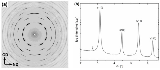 (a) High-energy X-ray diffraction (XRD) pattern of a B50 sample recorded with the primary beam in-plane. GD and ND indicate the growth direction and the in-plane direction, respectively; (b) Diffractogram obtained from (a) via integration over all azimuthal angles. The only indication of a small peak besides the ferritic phase is marked with an arrow.
