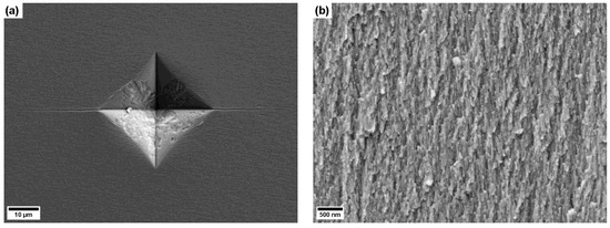 (a) SEM micrograph of a Vickers micro-indent on the cross-section of a B50 sample; (b) Exemplary fracture surface of an A65 sample after bending.