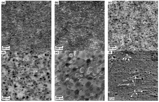 SEM micrographs after isothermal annealing for one hour. (a–d) are recorded with a backscatter-electron detector and show the structural evolution of A50 samples at (a) 200 °C, (b) 300 °C, (c) 400 °C, and (d) 500 °C. The lamellar structure observed in B50 samples at 600 °C is shown in (e). The structure after annealing at 800 °C is shown in (f) and selected elongated precipitates (L), spherical precipitates (S) and pores (P) are indicated. The growth direction is from left to right for all images.
