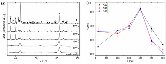 The hardness of the as-deposited samples in the current study is within the range of 600–800 HV that can be found in the literature [4,6,7,8,12,15]. The hardness of the B50 samples in this study is lower than the 810 HV reported for the same deposition conditions by Haseeb et al. [8]. Although the microstructure and the carbon contents look almost identical, this difference as well as the different hardness values in the literature might be a result of different experimental conditions leading to structural differences of the deposits, e.g., concerning oxygen contents and residual stresses. However, the different loads used in these studies (e.g., 20 g in [8] vs. 500 g in the present work) might also contribute to the hardness differences via the indentation size effect [28]. The lower hardness of the A50 samples as compared to the A65 and B50 structures in the present work is probably caused by the higher oxygen contents in this case which facilitate crack growth and, thus, penetration by the indenter. Strengthening via oxide formation or oxygen redistribution might explain the outbalancing of this hardness difference upon annealing.