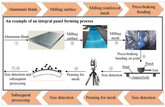 Figure 2 demonstrates the forming process of an integral panel. The process could be briefly described as follows: (1) A blank with the material of aluminum alloy 7050-T7451 is prepared; (2) A flat sheet is obtained by milling the upper and lower surfaces of the blank; (3) A panel with grid ribs is obtained by numerical control milling from the flat sheet; (4) The joint is adopted as the workpiece to be formed by the press-braking bending method; (5) Size detection is carried out to ensure the curvature of joint meets the requirements of manufacture; (6) Peening forming process as auxiliary process is adopted to form the grid and stiffeners; (7) and (8) are size detection and subsequent processing, respectively. The process of press-braking bending for joint (i.e., the step (4)) is the main content of this paper.