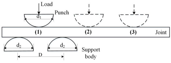 Figure 3 describes the loading sequence of press-braking bending, namely the step (4) shown in Figure 2. The span of the two support bodies is . The diameter of the punch and the support bodies are and , respectively. The load is applied step-by-step at the three pre-defined bending points (1), (2) and (3) with the sequence shown in Figure 3. The key principles of the bending process are: (a) the punch and support bodies are moved along the bending positions in an orderly manner; (b) the punch and support bodies are moved to the next position after the bending for one pressure point is finished; (c) the bending process is completed until the curvature meets the requirements of manufacture.