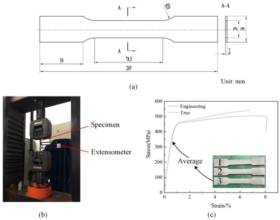 Uniaxial tensile test (a) geometric parameters of specimen (b) tensile process (c) Engineering and true stress-strain curve.