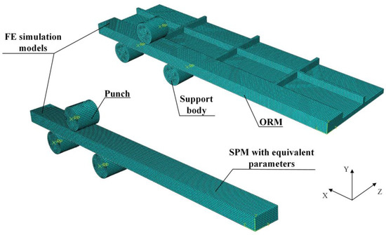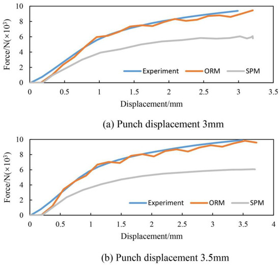 Figure 15 shows the comparison of the reaction force between FE simulation and experiment in the cases of punch displacement 3 mm and 3.5 mm. The FE simulation results of ORM show a good agreement with the experimental results. It is observed that the reaction force increases as the punch displacement increases. However, the error of the simulation results of SPM as compared with the experimental results is larger. The difference mainly results from factors such as ignoring the position change of the neutral surface, the error of material model, and the influence of the shear stress when calculating the equivalent parameters. It is also observed that the reaction force is zero with increasing punch displacement at the beginning of loading and the punch displacements exceed 3 mm and 3.5 mm at the end of loading in the FE simulation results, because the punch and support bodies are not fully contacted with the specimen in the assembly model and there is a 0.1 mm gap between them to ensure the convergence of FE calculation.