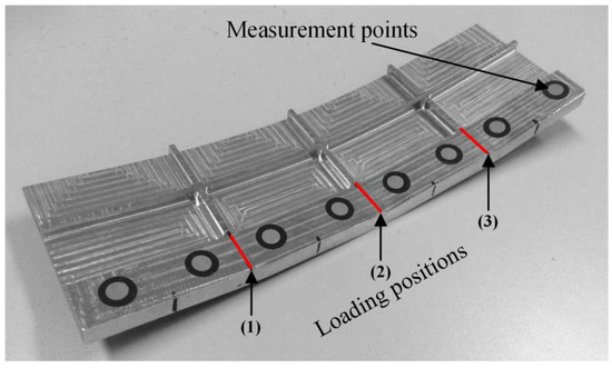 The CSS-44100 Electric Universal Testing Machine is used to validate the FE simulation model. The radius of both the punch and the support bodies are 15 mm, and the distance between the support bodies is 50 mm. The displacement of both the left and right bending points are 3 mm and the intermediate bending point is 3.5 mm. The loading positions (1), (2) and (3) are indicated in Figure 10. The measurement points are used to obtain the contour data of the bent specimen after unloading using portable 3D Photograph Meter.
