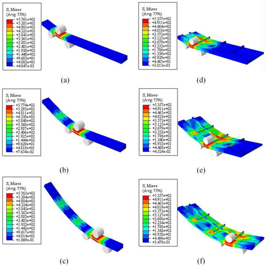 The successive forming process and the stress distribution of the SPM and the ORM can be seen in Figure 11, depicting the equivalent Mises stress in different loading positions of the formation process. It is seen that the Mises stress increases when the punch displacement increases from 3 mm to 3.5 mm, and as expected, the maximum Mises stresses are concentrated below the indenter and the bottom surface of the bent specimens. This stress distribution after punch displacement is consistent with the previous work by Anokye-Siribor [35], which means that the metal farther away from the neutral axis has been stressed beyond the yield strength, and has been plastically or permanently deformed. The maximum relative error of Mises stress between the SPM and ORM is 7.78%. Furthermore, it can be observed that the maximum Mises stress of the SPM is greater than that of the ORM; the difference may be due to the calculation error of the equivalent parameters. However, it is beneficial to ensure the forming quality of the ORM.