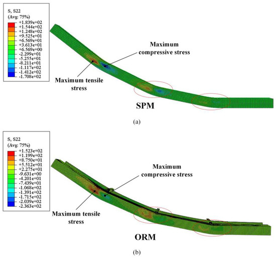 In the longitudinal direction, the residual stresses distribution of the SPM and the ORM after bending and springback at the end of the simulations are shown in Figure 12. The distribution is consistent with the research results of literature [36,37]. Namely, springback relaxes a large amount of stress and causes the tensile and compressive stresses to have their largest values near the neutral layer.
