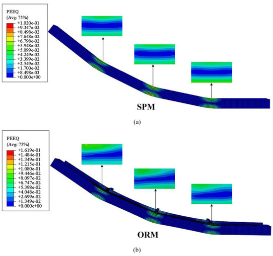 Equivalent plastic strain distribution of SPM (a) and ORM (b).