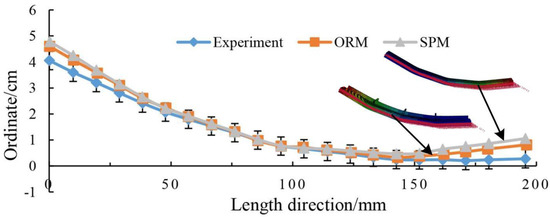 To verify the geometry of the final shapes of the forming workpieces after springback, the contour figure data of the ORM and the SPM are obtained from the FE simulation models when the forming processes are completed, as illustrated in Figure 12 and Figure 13. A good agreement between the SPM and the ORM can be observed in Figure 14, and the calculated error is less than 13.17%. Therefore, the SPM can simulate the bending forming of the ORM quite well. Compared with the experimental results, the deformation error of the ORM is slightly smaller than that of the SPM. The error between the FE simulations and the experimental results may result from the assumptions for theoretical analysis and FE simulation of bending process, and the error of the contour data of the bent specimen result from both the measurement method and fitting method. Moreover, the accuracy of indenter displacement also affects the final shapes of the forming workpieces in the bending experiment.