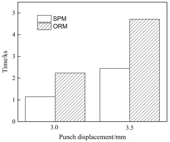 In terms of the efficiency of the FE simulation, the calculation time of the ORM and the SPM are compared in Figure 16. The efficiency has been improved by more than 48%. In terms of the structure, the SPM is consistent with the area of bending load applying of the ORM. Therefore, the SPM can replace the ORM in the optimization of bending process to lower the amount of iterative calculation. The efficiency of modeling and calculation can greatly improve, and the computing non-convergence is avoided.