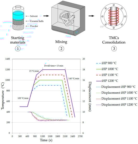 To graphically represent the development of the TMC fabrication process, Figure 2 shows a sketch of the equipment and the different manufacturing steps: (i) Preparation of starting materials; (ii) Mixing; and (iii) Hot Consolidation.