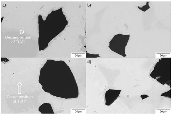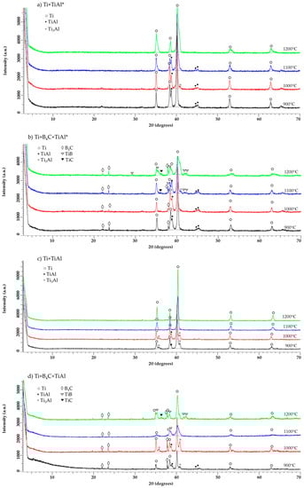 Comparing Figure 3b,d, there are substantial differences between patterns of specimens made from prealloyed TiAl* and Ti-Al blended powders, with the B4C particles processed at the same temperature. As previously mentioned, the presence of the TiAl phase is only detected up to 1100 °C when TiAl* prealloyed powder is used in the starting materials of specimens. In this respect, the presence of the B4C did not affect the TiAl stability.