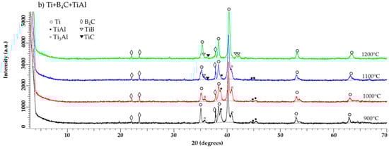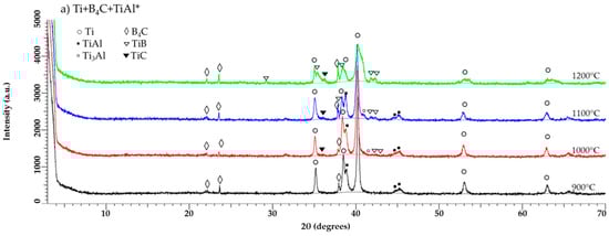 It should be borne in mind that Figure 3a,c show the patterns of specimens from Ti and TiAl powders without the B4C phase. By excluding the Ti peaks, there are crystalline phases related to the starting materials (TiAl prealloyed or blend powders). The effect of the temperature and the starting materials are reflected in the pattern of these specimens. It seems that in the specimens from Ti powder mixed with Ti-Al blend, peaks of Ti3Al and TiAl are appreciated only below 1000 °C. When prealloyed TiAl powder is used, peaks of TiAl phase are clearly observed even up to 1100 °C. These results suggest that this is due to the prealloyed powder being less reactive than the aluminum from the blend powder. Moreover, aluminum has a tendency to diffuse into the crystalline structure of Ti: it happens from 1200 °C if the raw powder is prealloyed, and from 1100 °C if the starting particles come from the blend Ti-Al. This means that, from 1100 °C, there are only peaks of titanium alpha phase in specimens whose starting powder was the Ti-Al blend; however, this phenomenon in specimens from Ti with prealloyed TiAl* takes place at 1200 °C.