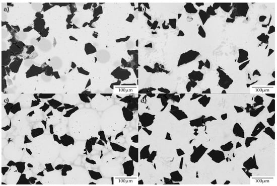 After the manufacture of the specimens, their characterization was carried out. Compacts were removed from the die and then sand-blasted cleaned to remove the graphite paper residue from the surfaces. Firstly, a microstructural study was performed, after a thorough metallographic preparation. The microstructure was studied by means of optical microscopy (OM), using Nikon Model Epiphot 200 (Tokyo, Japan), and by SEM, using JEOL 6460LV (Tokyo, Japan) and FEI Teneo (Hillsboro, OR, USA). Moreover, an XRD study was carried out on the Bruker D8 Advance A25 (Billerica, MA, USA) to identify and evaluate the diverse crystalline phases in the composites. Archimedes’ method (ASTM C373-14) was set for the determination of the density. The results obtained were compared to the measurements performed with other control techniques such as geometrical density (ASTM B962-13). On the polished cross-section of the specimens, the hardness measurements were carried out. Eight indentations were performed on each specimen, avoiding B4C particles. A tester model, Struers-Duramin A300 (Ballerup, Denmark), was used to ascertain the Vickers hardness (HV10). To complete the characterization of the specimens, an ultrasonic method (Olympus 38 DL, Tokyo, Japan) was used to calculate Young’s Modulus by measuring longitudinal and transverse propagation velocities of acoustic waves [].