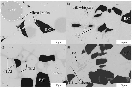 SEM images of the TMCs processed under 80 MPa for 5 min, from the starting materials: (a) Ti matrix with TiAl* and B4C particles at 1000 °C; (b) Ti matrix with TiAl* and B4C particles at 1200 °C; (c) Ti matrix with Ti-Al and B4C particles at 1000 °C; (d) Ti matrix with Ti-Al blend and B4C particles at 1000 °C.