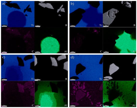 For the conclusion of the microstructural study, a compositional mapping of several elements (Ti, Al, C, and B) is carried out to determine the possible reactions of the constituents of the TMCs at the four processing temperatures tested (900 °C, 1000 °C, 1100 °C, and 1200 °C). The specimens studied are those of the TMCs with TiAl* under 80 MPa. The influence of the temperature in the microstructural evolution can be well appreciated in Figure 8. By hot pressing at 900 °C, there are clear areas corresponding to the intermetallic TiAl from the prealloyed powder (TiAl*), Ti matrix, and the B4C particles. As the temperature rises, through the diffusion and reaction of the elements, the in situ secondary phases appear. These reactions become more evident from 1100 °C. Additionally, the intermetallic compound begins to be more reactive. In this way, the aluminum diffusion into the matrix is more noticeable at 1100 °C as displayed in Figure 8c. Owing to the increment of the temperature up to 1200 °C, the decomposition and reaction of the intermetallic compounds become imminent. Furthermore, as demonstrated in previous research work and mentioned previously, the higher the processing temperature, the greater the content of TiB and TiC phases, and the lower the intermetallic-phase content.