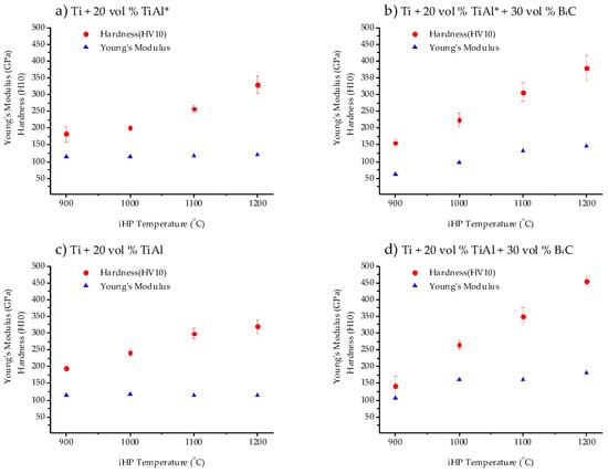 (All the specimens consolidated at 40 MPa). Processing temperature (°C) vs. hardness (HV10) and Young’s Modulus (GPa): (a) Ti + 20 vol % TiAl*; (b) Ti + 20 vol % TiAl* + 30 vol % B4C; (c) Ti + 20 vol % TiAl; (d) Ti + 20 vol % TiAl + 30 vol %B4C.