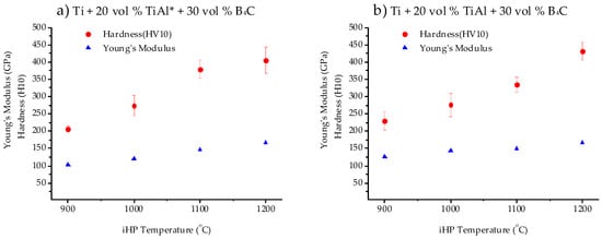 (All the specimens consolidated at 80 MPa). Processing temperature (°C) vs. hardness (HV10) and Young’s Modulus (GPa): (a) Ti + 20 vol % TiAl* + 30 vol % B4C; (b) Ti + 20 vol % TiAl + 30 vol % B4C.