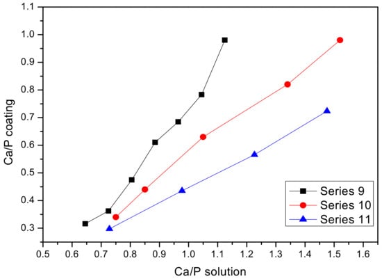 Relationship between the Ca/P ratio in the coating and that in the solution (for the electrolytes of series 9, 10, and 11).