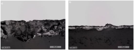 In order to choose the most appropriate electrolyte for further PEO experiments, the cross-section and surface morphology of two layers having comparable value of Ca/P in the coating (about 1) were examined. Figure 4a shows optical cross-sections of the first sample with (Ca/P)coat = 0.98, obtained with the electrolyte of series 9. The second sample (Figure 4b) with (Ca/P)coat = 0.99 was anodized in the electrolyte of series 10 having (Ca/P)sol = 1.52.